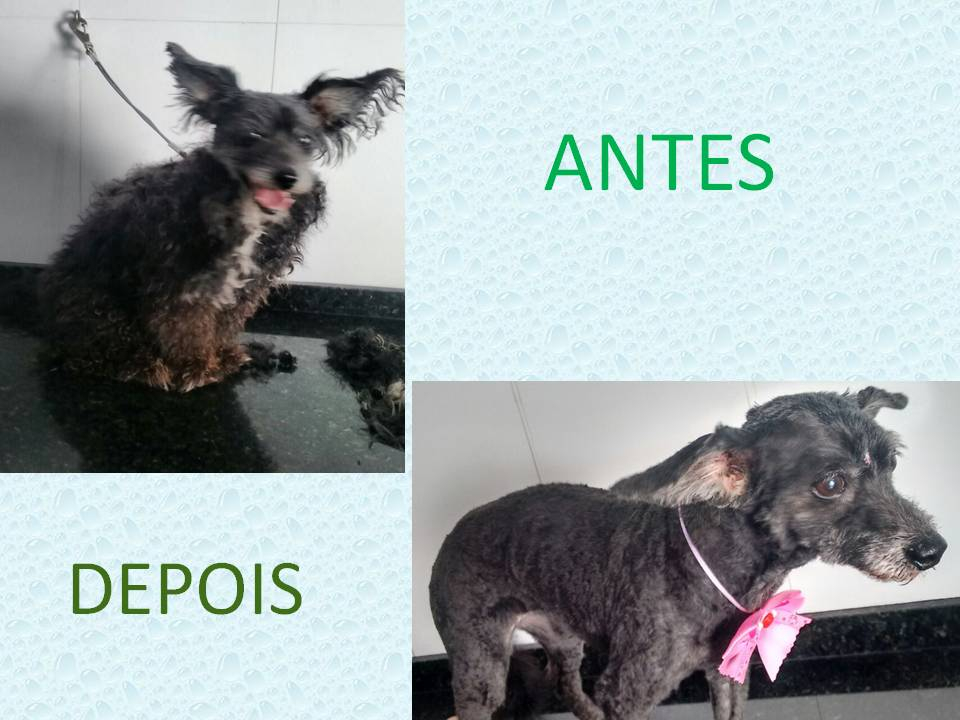 Apresentamos o antes e o depois da Lola, ela esta linda e bem cheirosa.